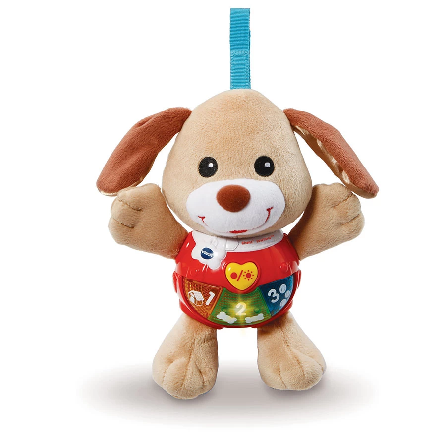 Un hochet musical et lumineux avec la tête et les petites pattes en tissu tout doux !