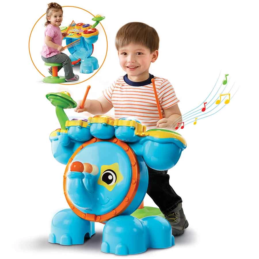 4 styles de batteries sont possibles : en mode rock, sons rigolos, orchestre ou animaux, pour jouer de la musique sans jamais se lasser ! Trop rigolo, Grâce à sa trompe, l’enfant peut même activer et entendre le son de la grosse caisse.
