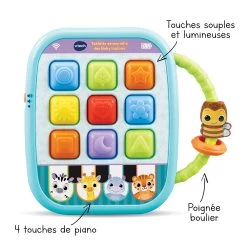 Notre gentil éléphant mélomane invite votre enfant à jouer de la batterie et l’initie à la musique grâce à ses boutons lumineux et interactifs