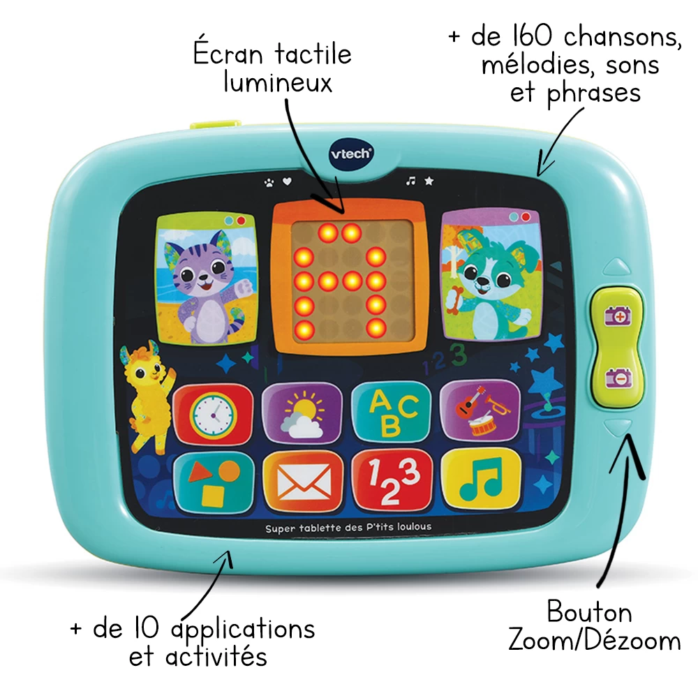 L’écran tactile lumineux permet à Bébé de découvrir, les lettres, les chiffres et les formes. Votre tout-petit explore également les différentes activités contenues dans les applications et découvre des chansons et des mélodies.