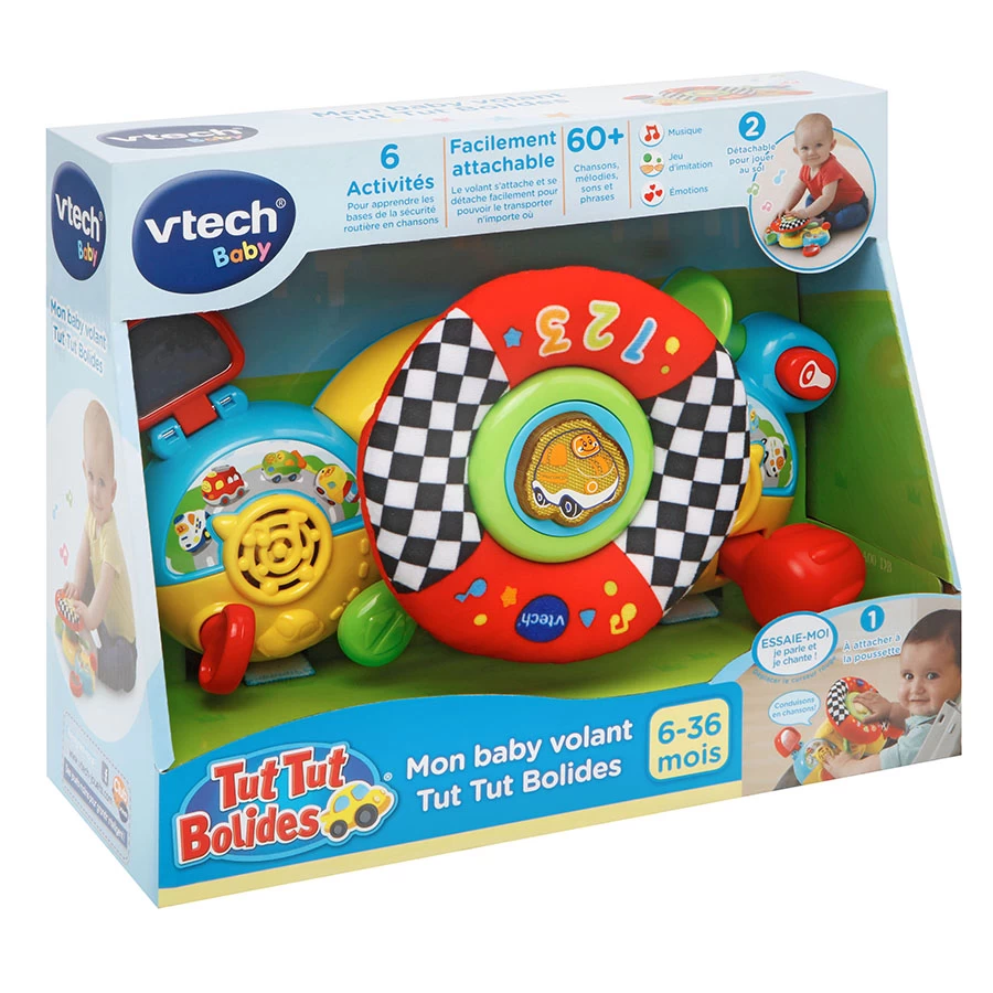 Comme sur un vrai tableau de bord, il dispose d’un clignotant, d’un levier de vitesses, d’une clé et même d’un Klaxon ! Le volant est interactif : des sons, chansons et conseils sur la sécurité routière se déclenchent lorsque Bébé joue.