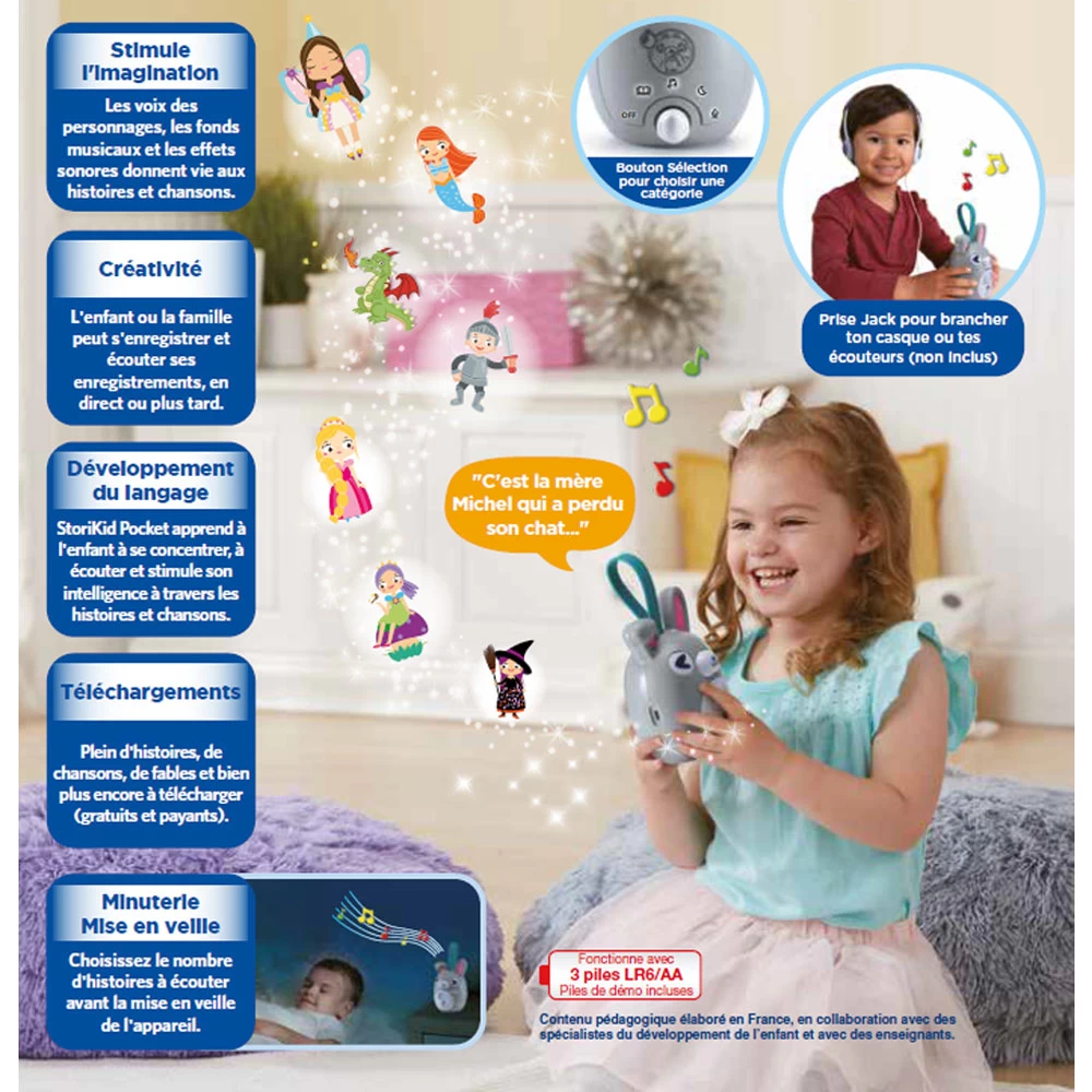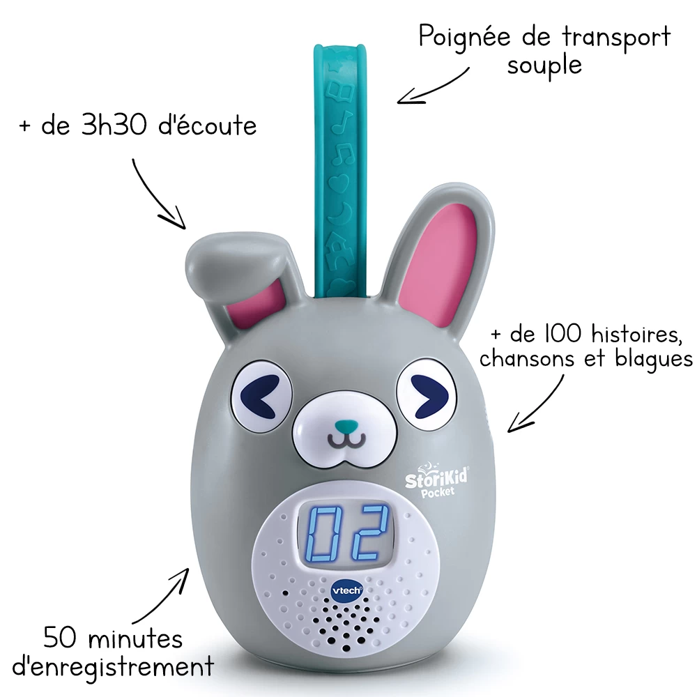 - Avec son format compact et sa poignée de transport souple, StoriKid Pocket est le compagnon idéal de votre enfant. Il raconte des histoires, des chansons, des blagues, des histoires pour s’endormir et bien plus encore. Sans ondes et sans écran, il accompagne l’enfant partout, du matin jusqu’au soir.