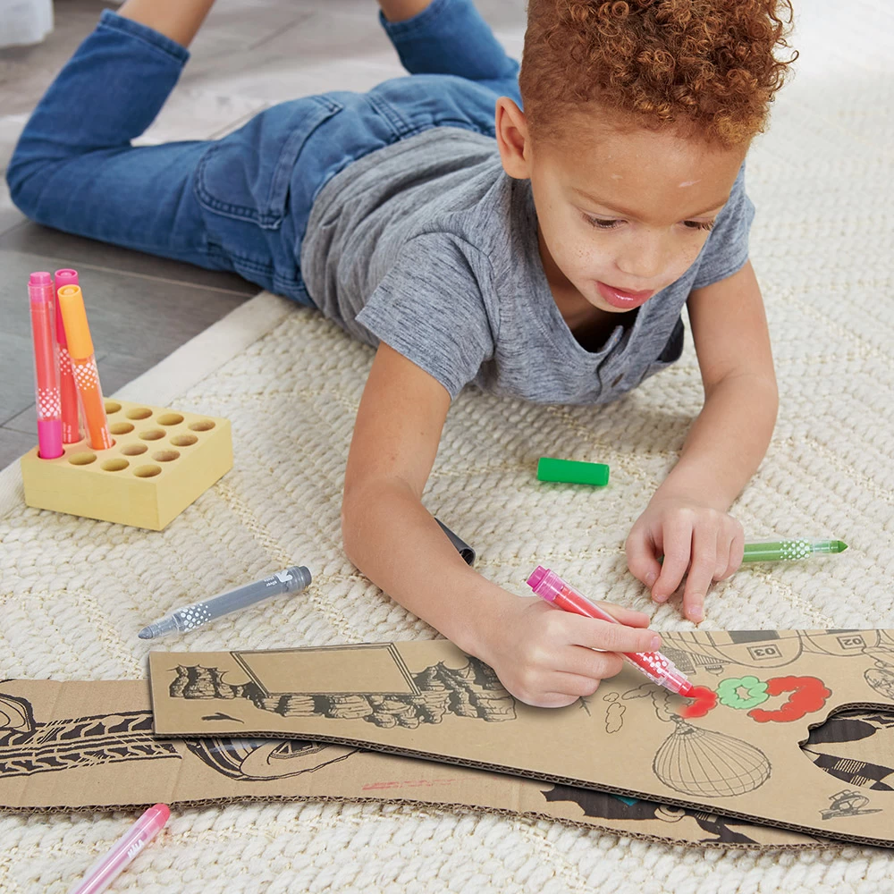 Votre enfant a la possibilité d’étendre son circuit à l’infini en ajoutant de nouvelles pistes à partir de cartons qu’il trouve à la maison. Il peut également colorier et customiser son parcours pour le rendre encore plus cool et le personnaliser à son goût !